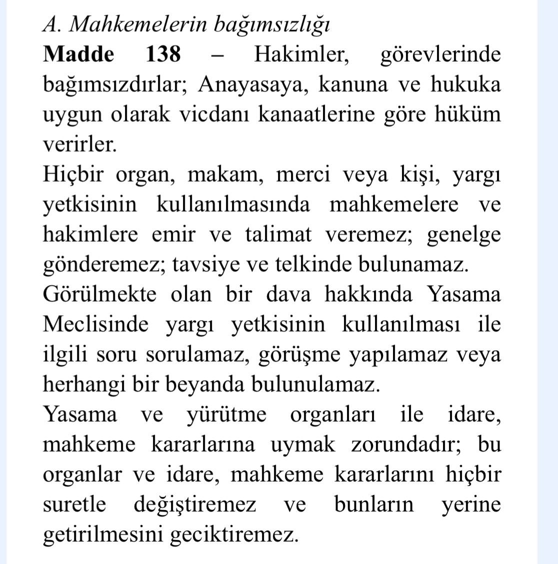 Anayasamızın 138. Maddesine göre; görülmekte olan bir dava ile ilgili hiçbir organ, yasama meclisi, makam, mevki ya da kişi emir, talimat ya da tavsiye veremez; telkin ya da beyanatta bulunamaz…