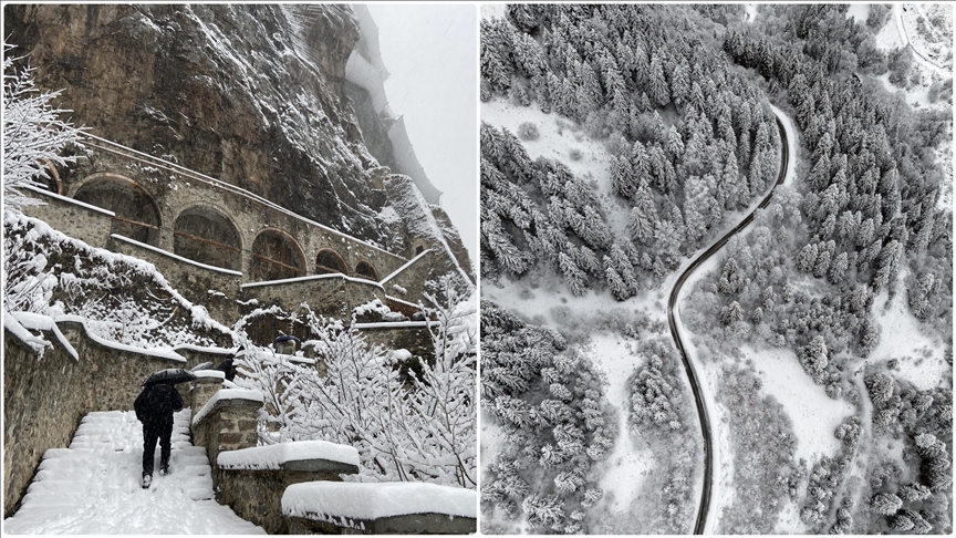 Karadağ'ın Altındere Vadisi'ne bakan eteğinde, vadiden yaklaşık 300 metre yükseklikteki ormanlık alanda kayalar oyularak yapılmış ve halk arasında "Meryem Ana" adıyla bilinen Sümela Manastırı da etkili yağışın ardından beyaza büründü.
