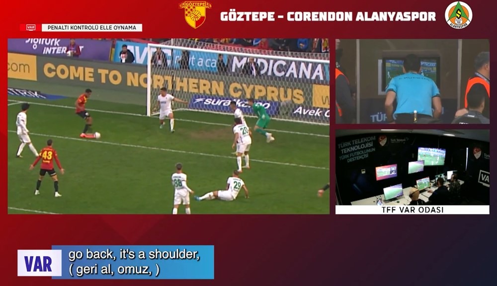 Göztepe - Alanyaspor müsabakasının 59. dakikasında sarı-kırmızılıların atağında hakem Arda Kardeşler, ceza sahasında elle oynama nedeniyle bir kez daha penaltı noktasını gösterdi.