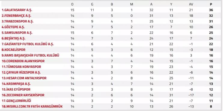 Süper Lig'de oynanan maçların ardından oluşan puan durumu şu şekilde: