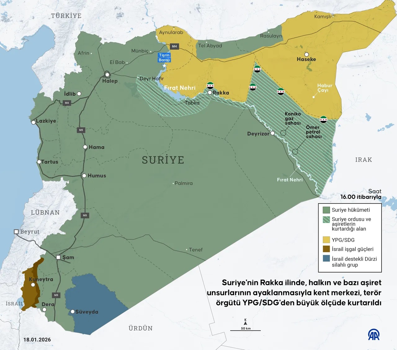 Yayımlanan nüfuz haritalarında, Suriye ordusunun Fırat’ın batısından doğusuna uzanan hatta kontrol alanlarını genişlettiğini ortaya koyuyor. Haritada; Deyr ez Zor, Deyr Hafir, Tabka ve Rakka’daki saha değişimleri net şekilde görülürken, SDG/YPG’nin bu bölgelerden çekildiği alanlar dikkat çekiyor.