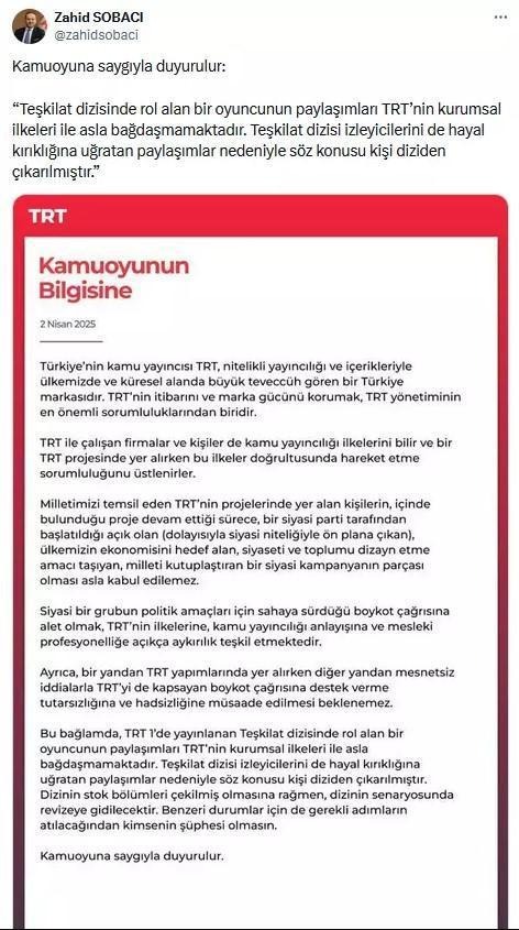 Bu bağlamda, TRT 1'de yayınlanan Teşkilat dizisinde rol alan bir oyuncunun paylaşımları TRT'nin kurumsal ilkeleri ile asla bağdaşmamaktadır. Teşkilat dizisi izleyicilerini de hayal kırıklığına uğratan paylaşımlar nedeniyle söz konusu kişi diziden çıkarılmıştır. Dizinin stok bölümleri çekilmiş olmasına rağmen, dizinin senaryosunda revizeye gidilecektir. Benzeri durumlar için de gerekli adımların atılacağından kimsenin şüphesi olmasın."