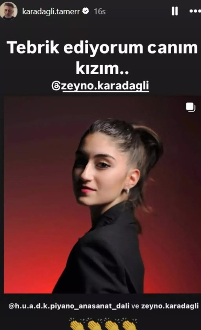 Hacettepe Üniversitesi Konservatuvar öğrencisi olan Zeyno Karadağlı'yı babası sosyal medya hesabından yaptığı bir paylaşımla tebrik etti. Kızının fotoğrafını paylaşan Karadağlı, "Tebrik ediyorum canım kızım. Yolun hep açık başarıların her daim senle olsun" ifadelerine yer verdi.