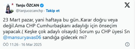 Özcan yaptığı paylaşımda, “23 Mart pazar, yani haftaya bu gün..Karar doğru veya değil.Ama CHP Cumhurbaşkanı adaylığı için önseçim yapacak.( Keşke çok adaylı olsaydı) Sorum şu CHP üyesi Sn @mansuryavas06 sandığa gidecek mi?” dedi.