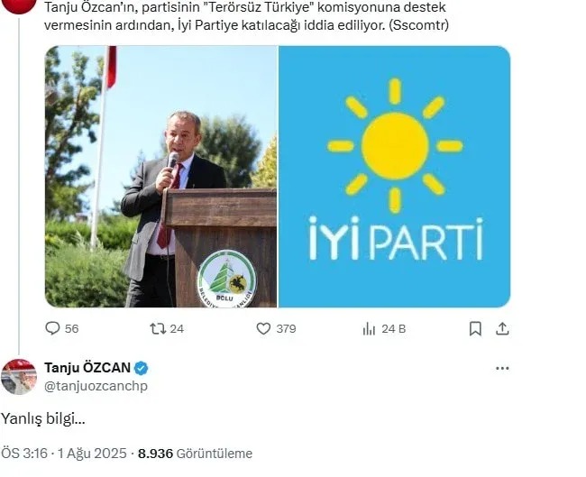Özcan ise bu iddianın paylaşıldığı bir haber sayfasının altına "Yanlış bilgi" notunu düştü.