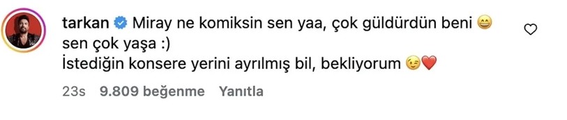 Tarkan, Miray Akovalıgil’in videosuna yaptığı yorumda şu ifadeleri kullandı: