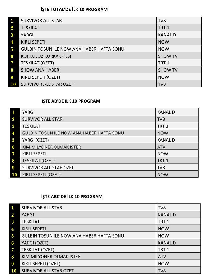 ABC'de ise 1.sırada “Yargı”, 2.sırada “Survivor All Star”, 3.sırada “Teşkilat” yer aldı.