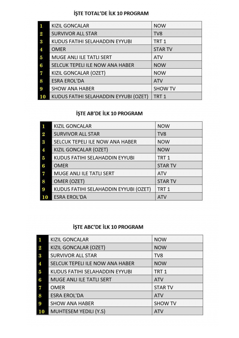 ABC'de ise 1.sırada “Kızıl Goncalar”, 2.sırada “Kızıl Goncalar” dizisinin özeti, 3.sırada “Survivor All Star” yer aldı.