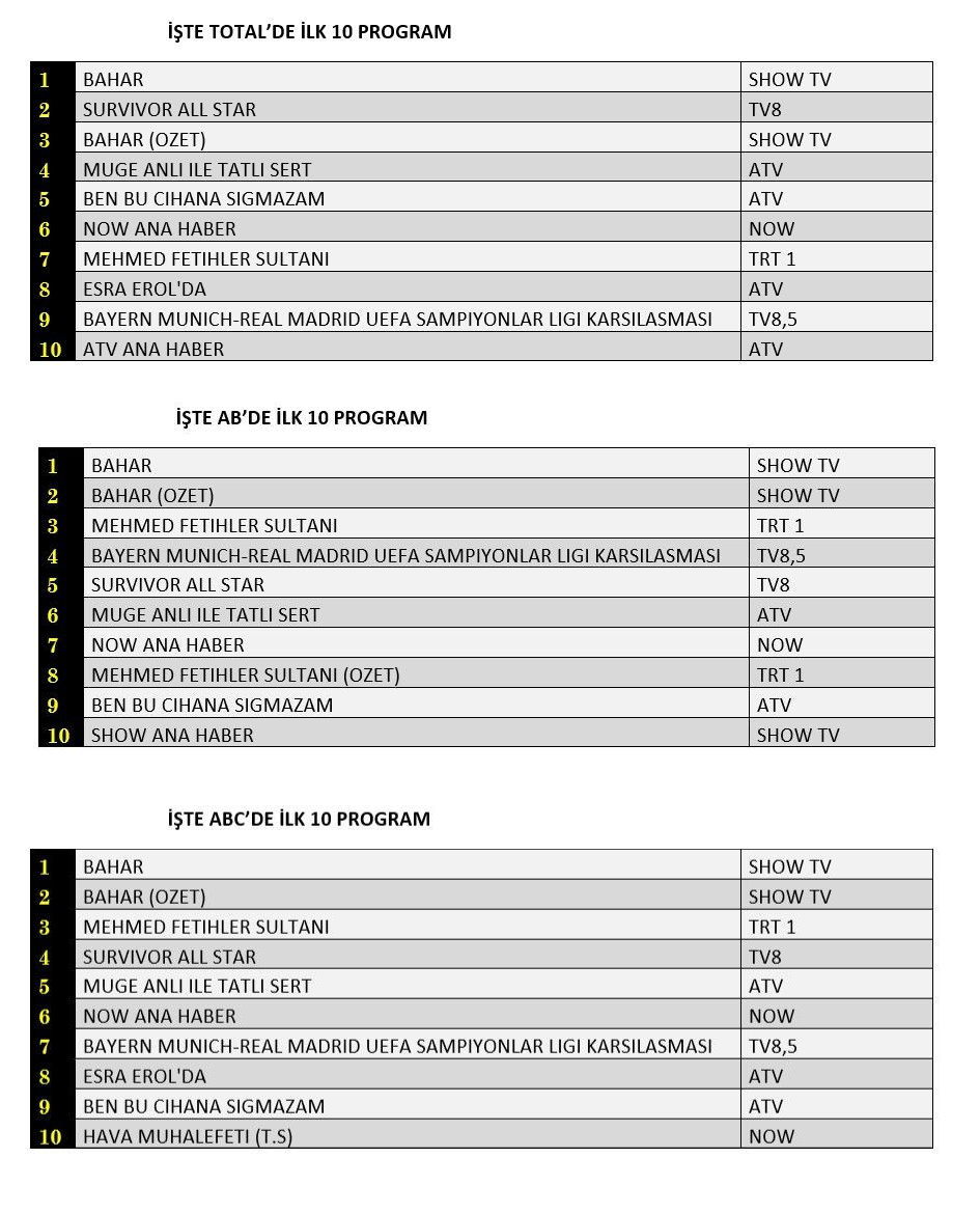 Total'de 1.sırada Show TV’de izleyiciyle buluşan “Bahar”, 2. sırada TV8’de yayınlanan “Survivor All Star”, 3.sırada “Bahar” dizisinin özeti yer aldı.