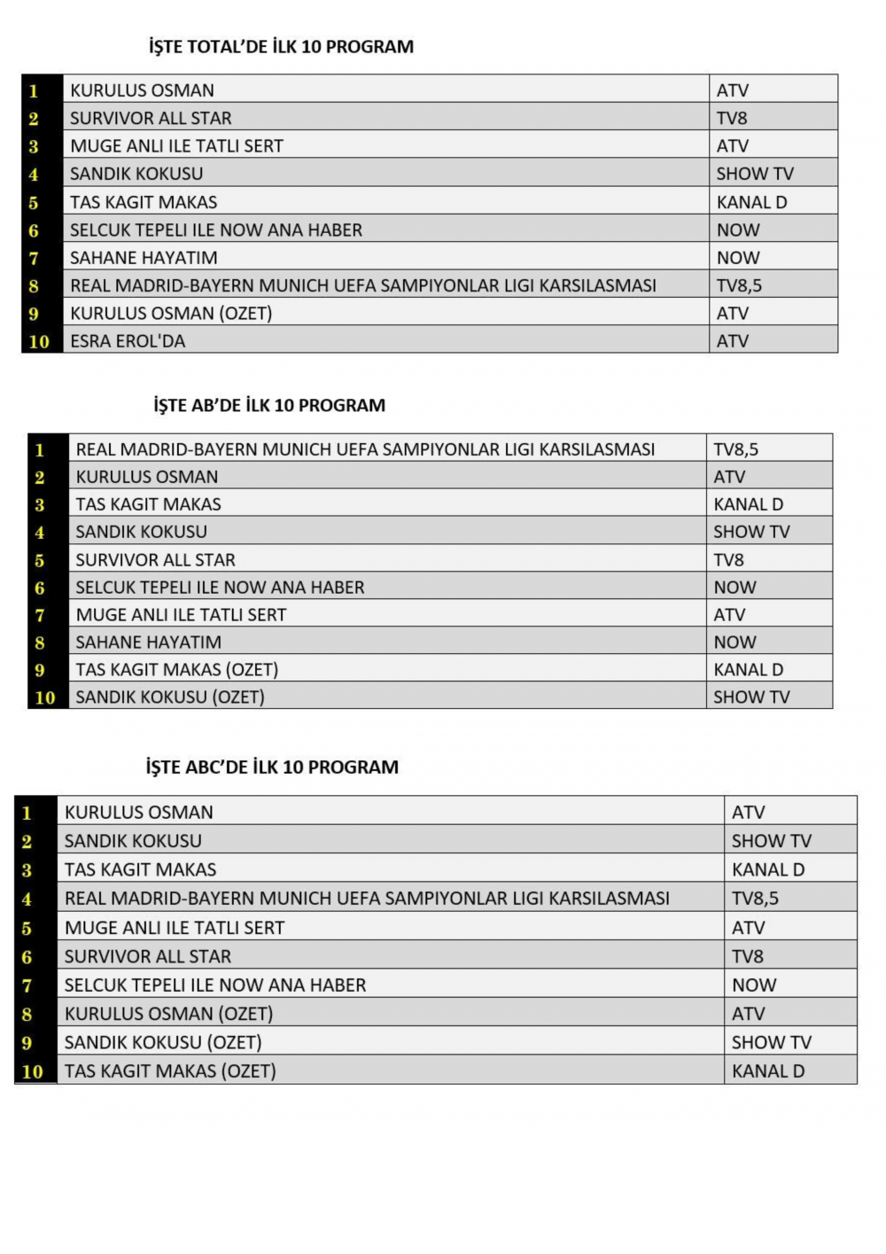 AB'de 1.sırada “Real Madrid-Bayern Münich UEFA Şampiyonlar Ligi Karşılaşması”, 2.sırada “Kuruluş Osman”, 3.sırada Kanal D’de yayınlanan “Taş Kağıt Makas” yer aldı.