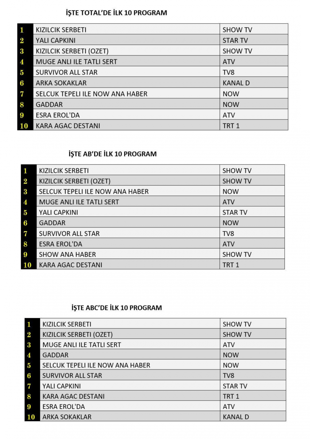 ABC'de ise 1.sırada “Kızılcık Şerbeti”, 2.sırada “Kızılcık Şerbeti” dizisinin özeti, 3.sırada Atv’de yayınlanan “Müge Anlı İle Tatlı Sert” yer aldı.
