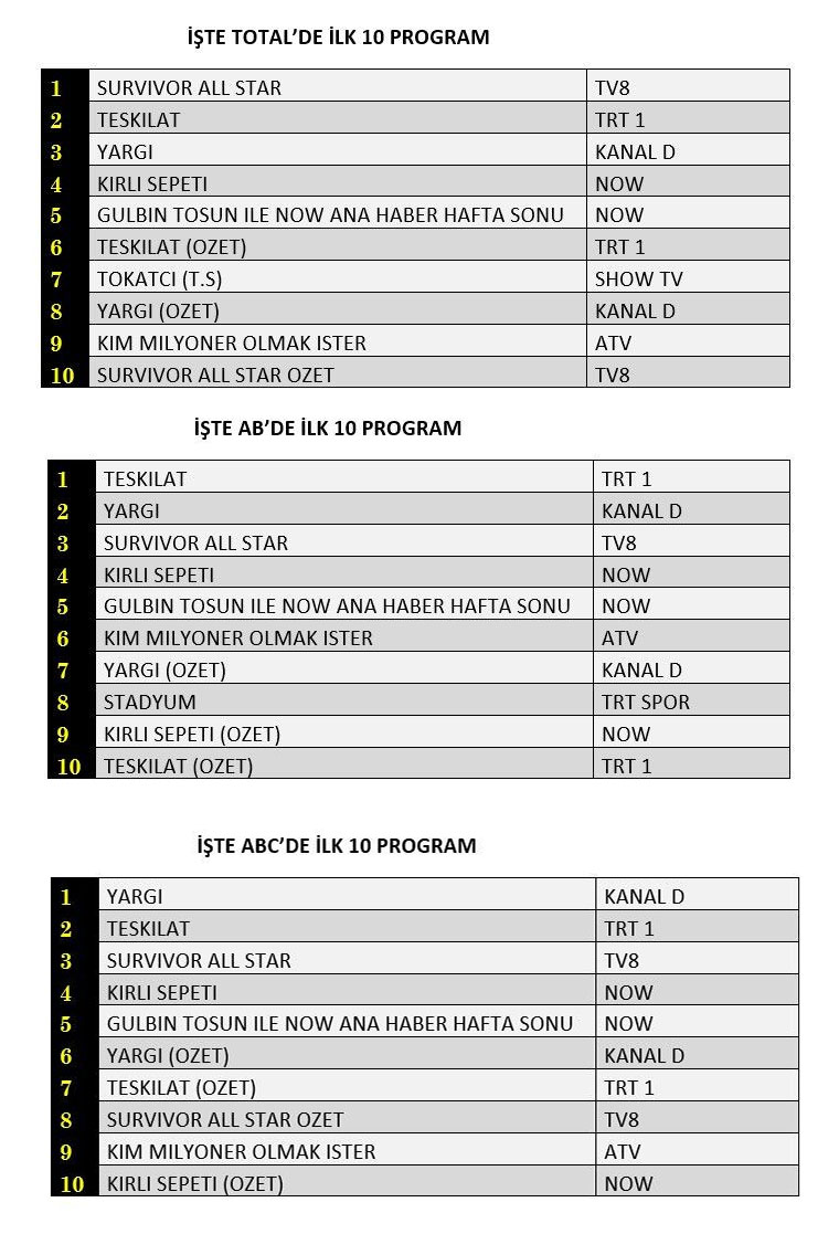 ABC'de ise 1.sırada “Yargı”, 2.sırada “Teşkilat”, 3.sırada “Survivor All Star” yer aldı.