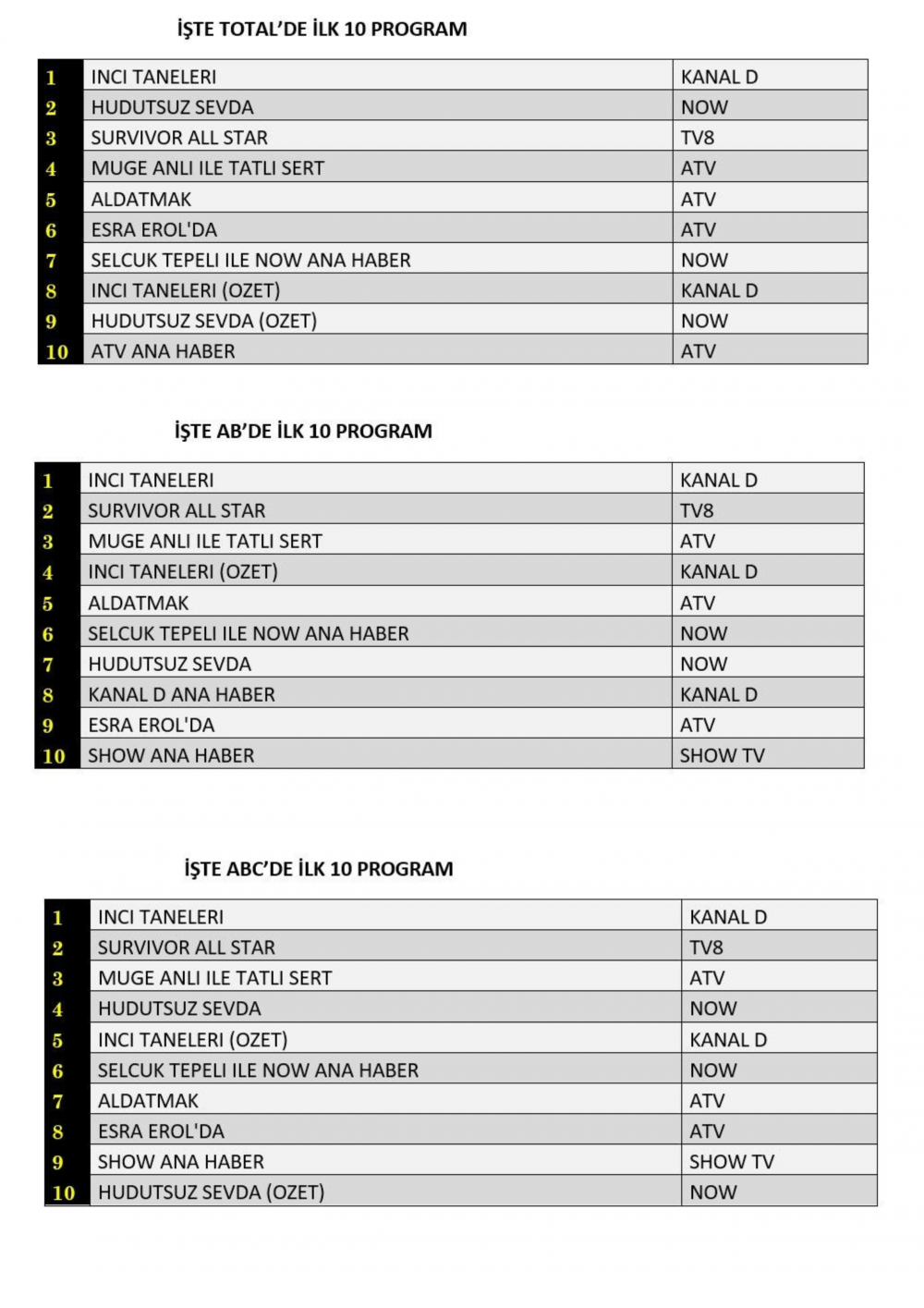 ABC'de ise 1.sırada “İnci Taneleri”, 2.sırada “Survivor All Star”, 3.sırada Atv’de yayınlanan “Müge Anlı İle Tatlı Sert” yer aldı.