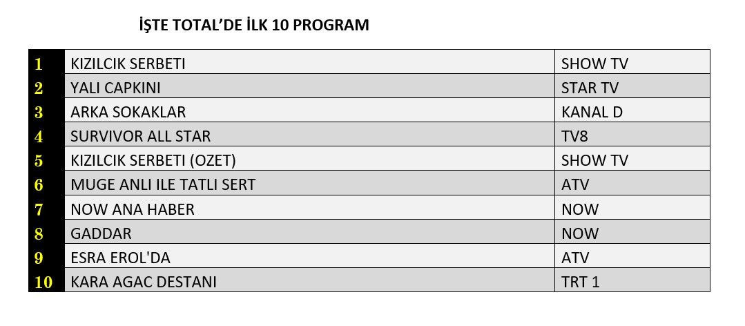 Total'de 1. sırada Show TV’de izleyiciyle buluşan “Kızılcık Şerbeti”, 2. sırada Star TV’de ekrana gelen “Yalı Çapkını”, 3. sırada Kanal D’de yayınlanan “Arka Sokaklar” yer aldı.