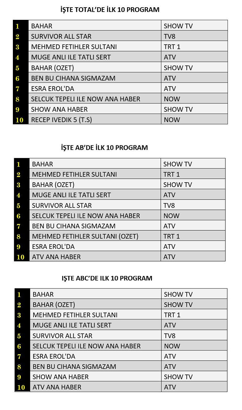 Total'de 1.sırada Show TV’de izleyiciyle buluşan “Bahar”, 2. sırada TV8’de ekrana gelen “Survivor All Star”, 3.sırada TRT1’de yayınlanan “Mehmed Fetihler Sultanı” yer aldı.