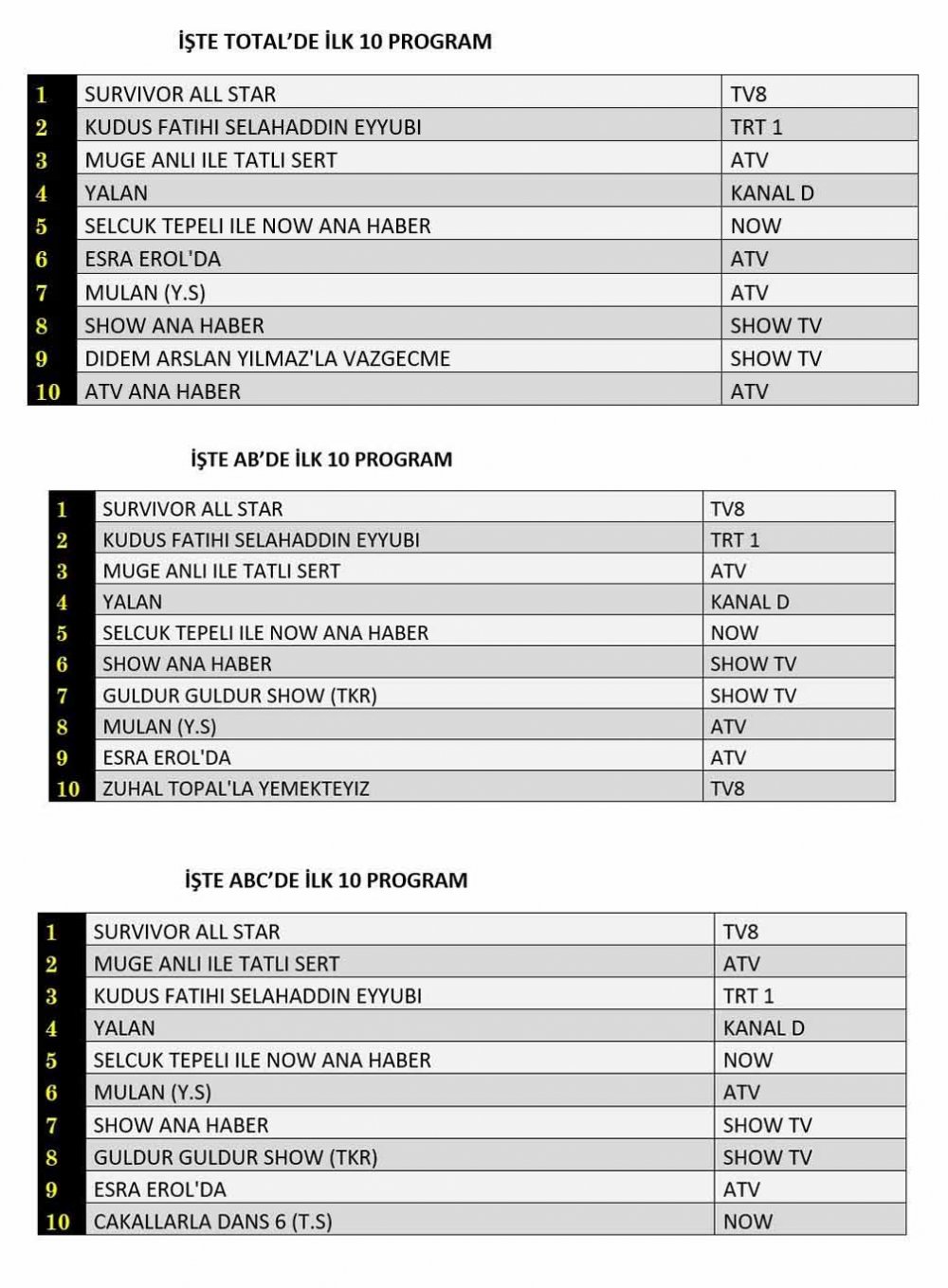 AB'de 1.sırada “Survivor All Star”, 2.sırada “Kudüs Fatihi Selahaddin Eyyubi”, 3.sırada “Müge Anlı İle Tatlı Sert” yer aldı.