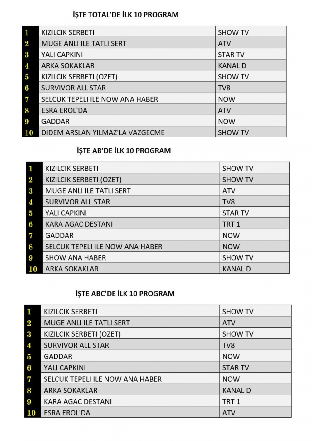 ABC'de ise 1.sırada “Kızılcık Şerbeti”, 2.sırada “Müge Anlı İle Tatlı Sert”, 3.sırada “Kızılcık Şerbeti” dizisinin özeti yer aldı.