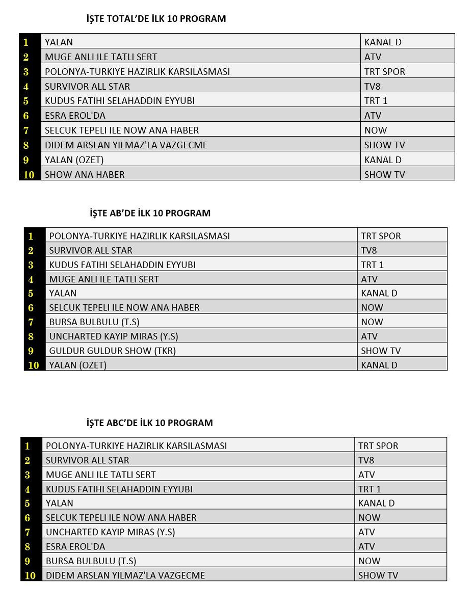 ABC'de ise 1.sırada “Polonya-Türkiye Hazırlık Karşılaşması”, 2.sırada “Survivor All Star”, 3.sırada “Müge Anlı İle Tatlı Sert” yer aldı.