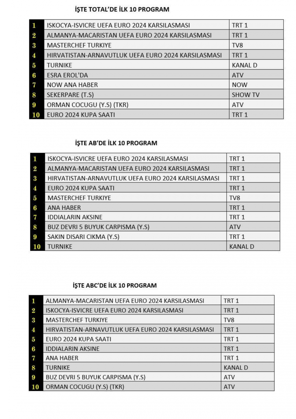 AB'de 1.sırada “İskoçya-İsviçre UEFA Euro 2024 Karşılaşması”, 2.sırada “Almanya-Macaristan UEFA Euro 2024 Karşılaşması”, 3.sırada TRT1’de ekrana gelen “Hırvatistan-Arnavutluk UEFA Euro 2024 Karşılaşması” yer aldı.