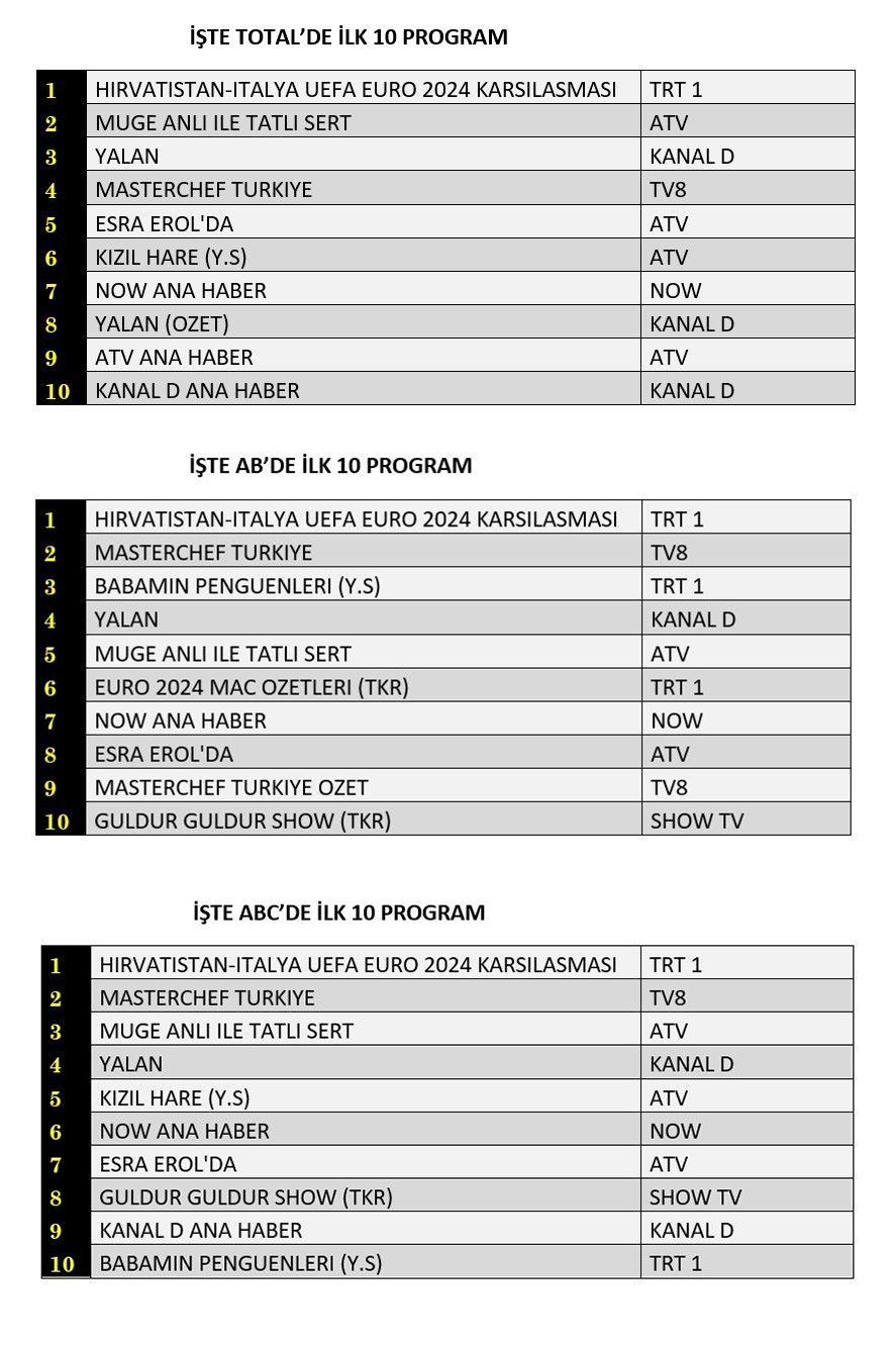 ABC'de ise 1.sırada “Hırvatistan-İtalya UEFA Euro 2024 Karşılaşması”, 2.sırada “Masterchef Türkiye”, 3.sırada “Müge Anlı İle Tatlı Sert” yer aldı.