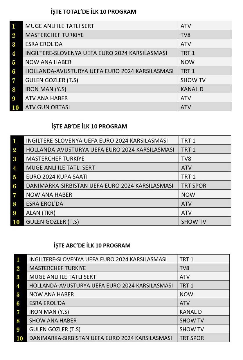 ABC'de ise 1.sırada “İngiltere-Slovenya UEFA Euro 2024 Karşılaşması”, 2.sırada “Masterchef Türkiye”, 3.sırada “Müge Anlı İle Tatlı Sert” yer aldı.