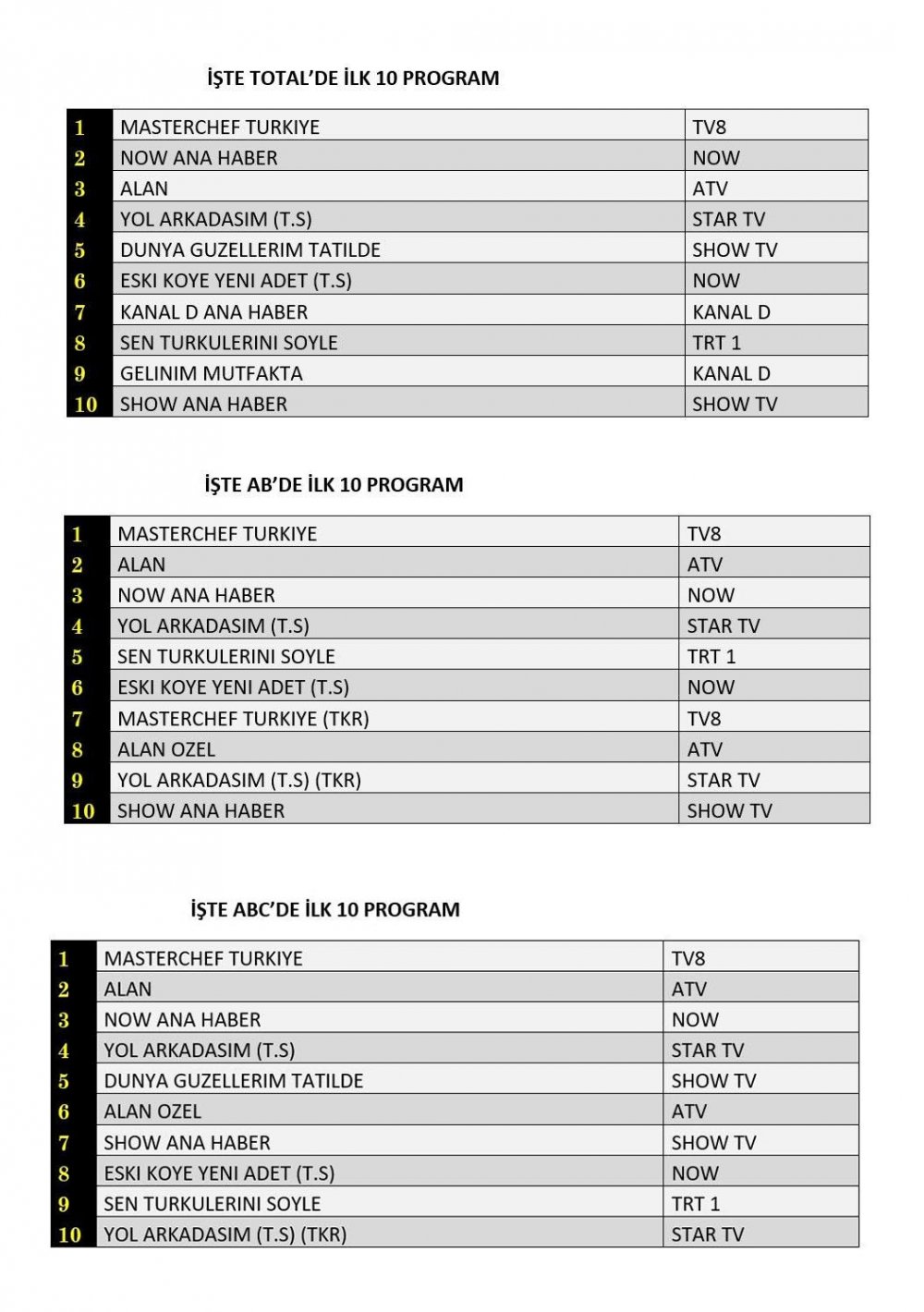 ABC'de ise 1.sırada “Masterchef Türkiye”, 2.sırada “Alan”, 3.sırada “Now Ana Haber” yer aldı.
