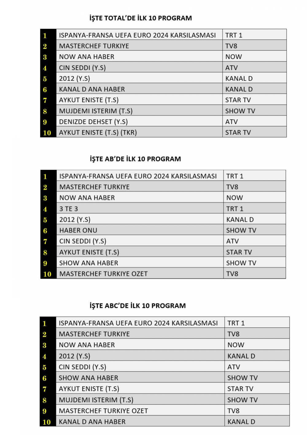 ABC'de ise 1.sırada “İspanya-Fransa UEFA Euro 2024 Karşılaşması”, 2.sırada “Masterchef Türkiye”, 3.sırada “Now Ana Haber” yer aldı.