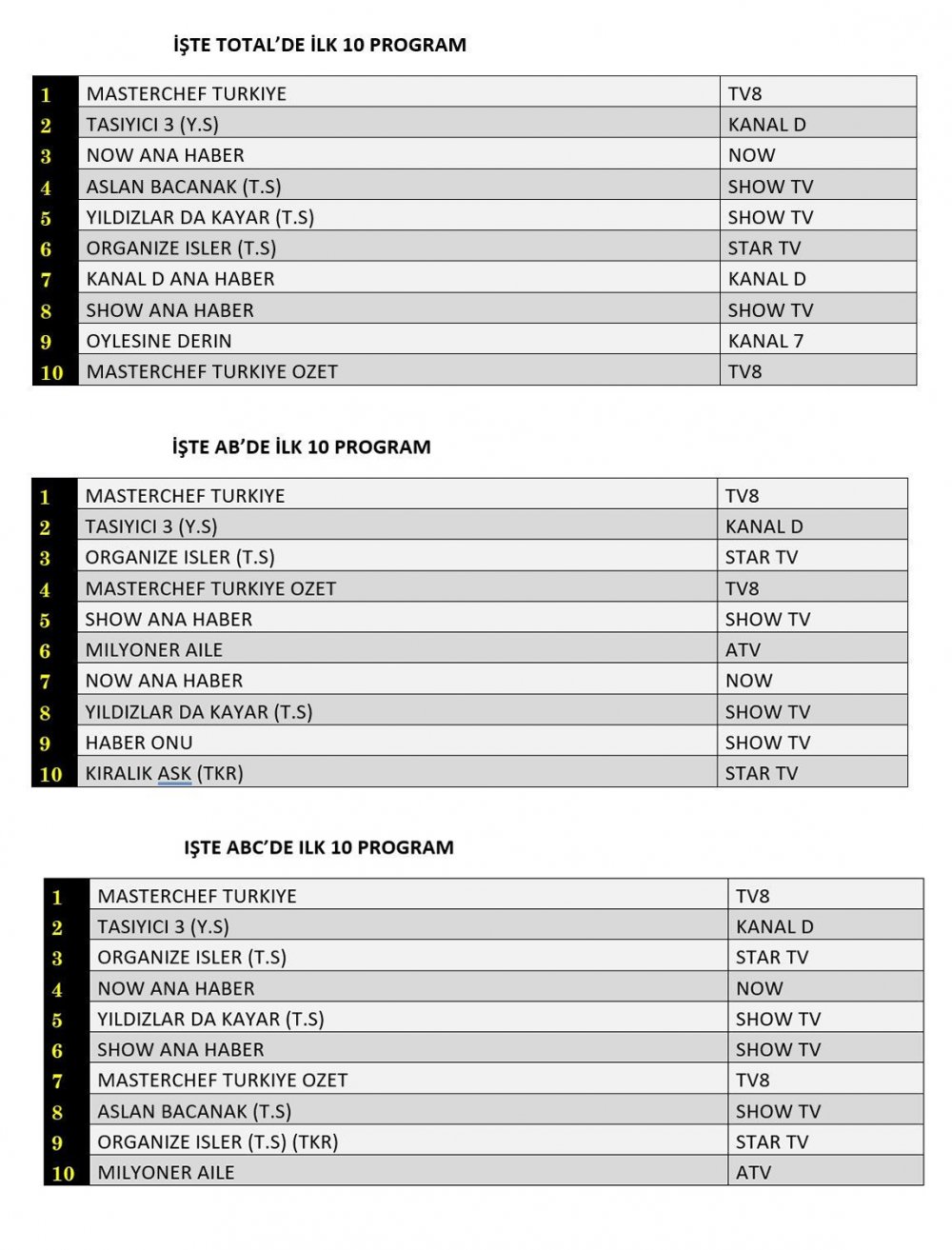 ABC'de ise 1.sırada “Masterchef Türkiye”, 2.sırada “Taşıyıcı 3”, 3.sırada “Organize İşler” yer aldı.