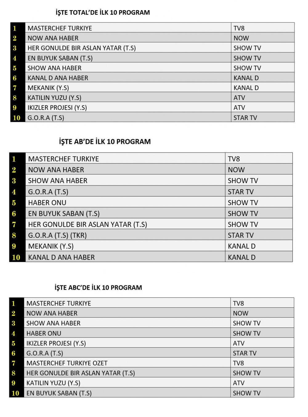 ABC'de ise 1.sırada “Masterchef Türkiye”, 2.sırada “Now Ana Haber”, 3.sırada “Show Ana Haber” yer aldı.