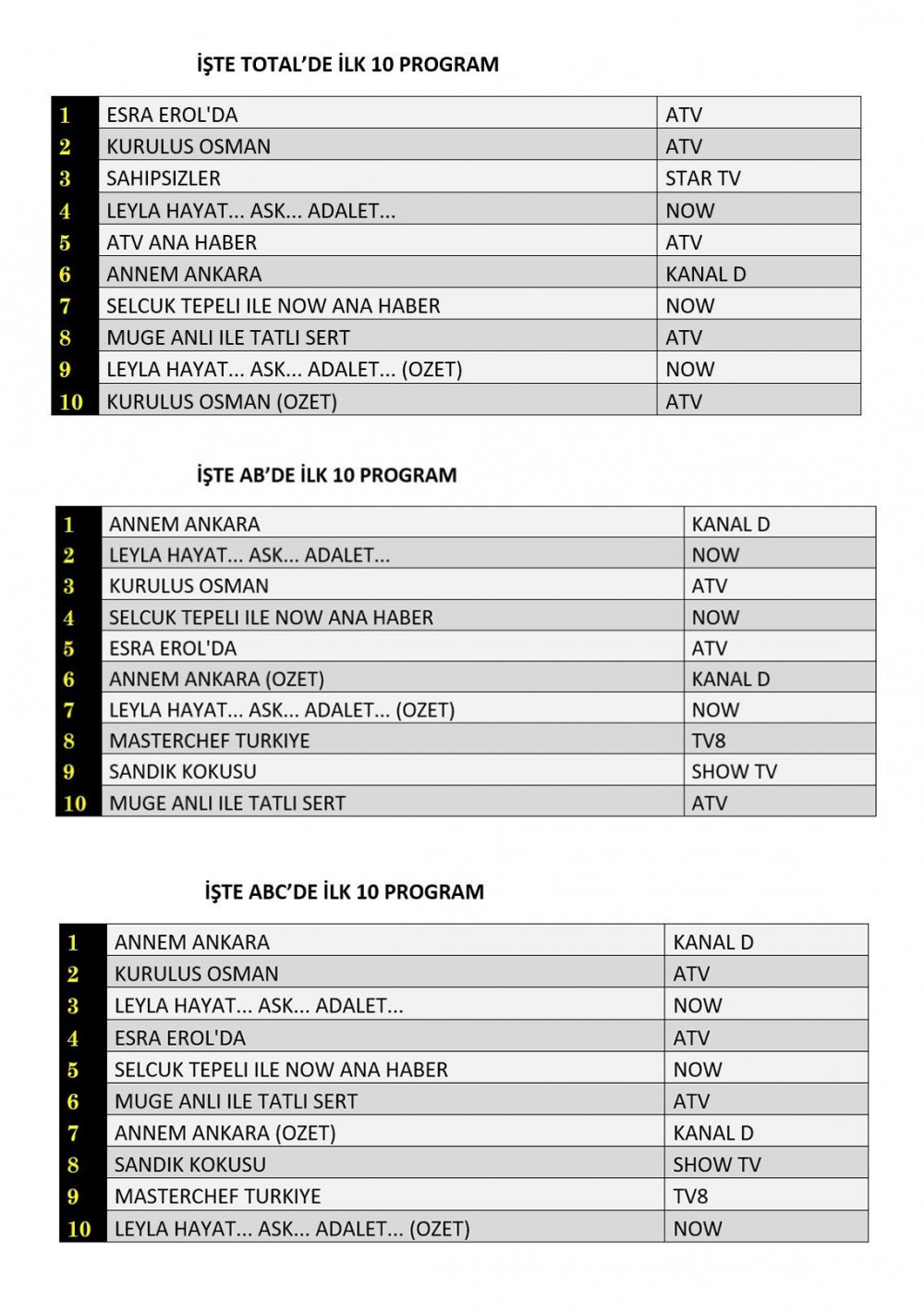 ABC katagorisinde Annem Ankara dizisi, ikinci sırada Kuruluş Osman üçüncü sırada Leyla Hayat… Aşk… Adalet…dizisi yer aldı.