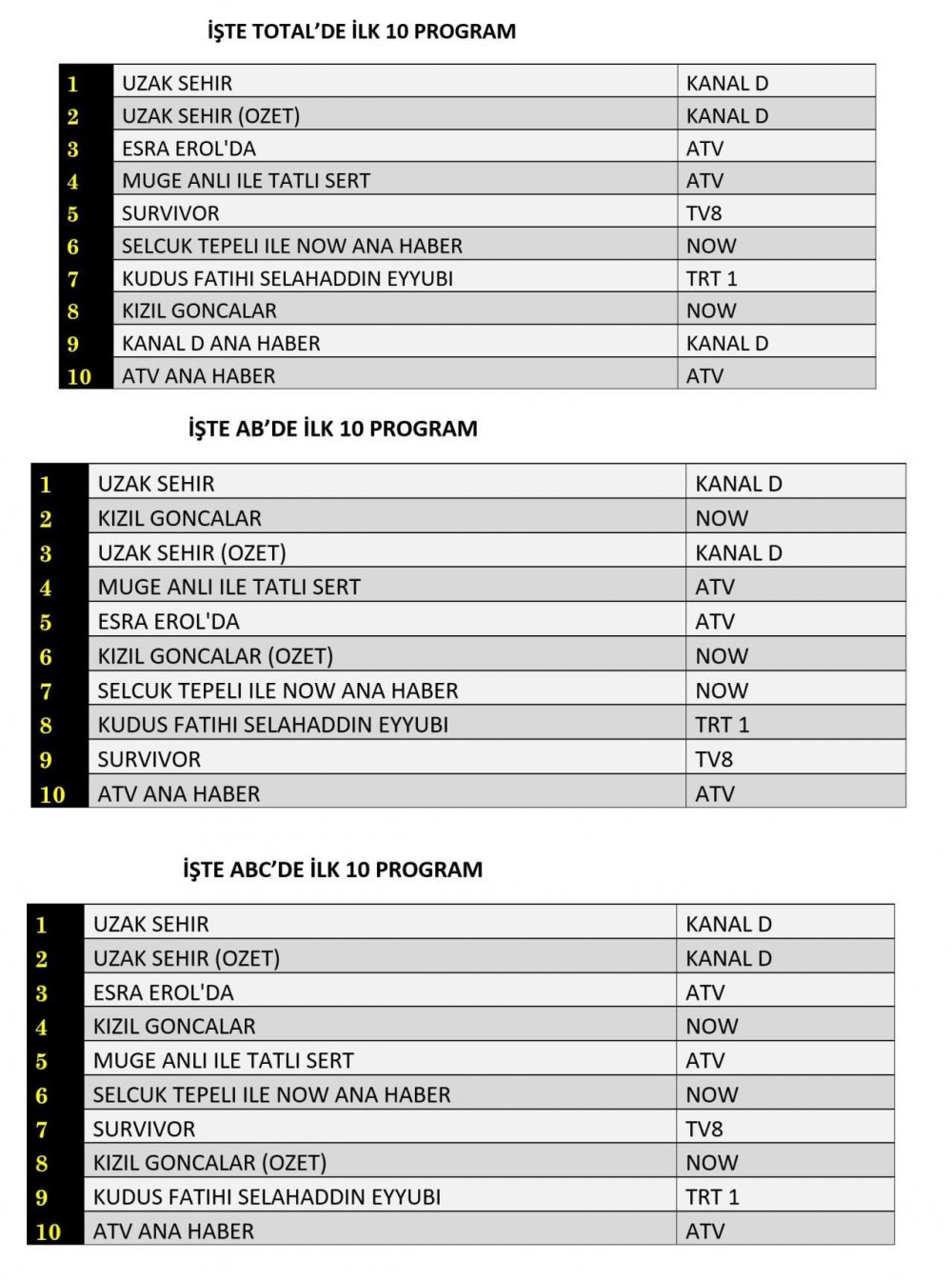 Total grubunda Kanal D’nin yeni dizisi Uzak Şehir, hem ana bölümü hem özetiyle zirveyi kaptı. Atv’nin gündüz kuşağı programı Esra Erol’da ise üçüncü sırada kendine yer buldu.