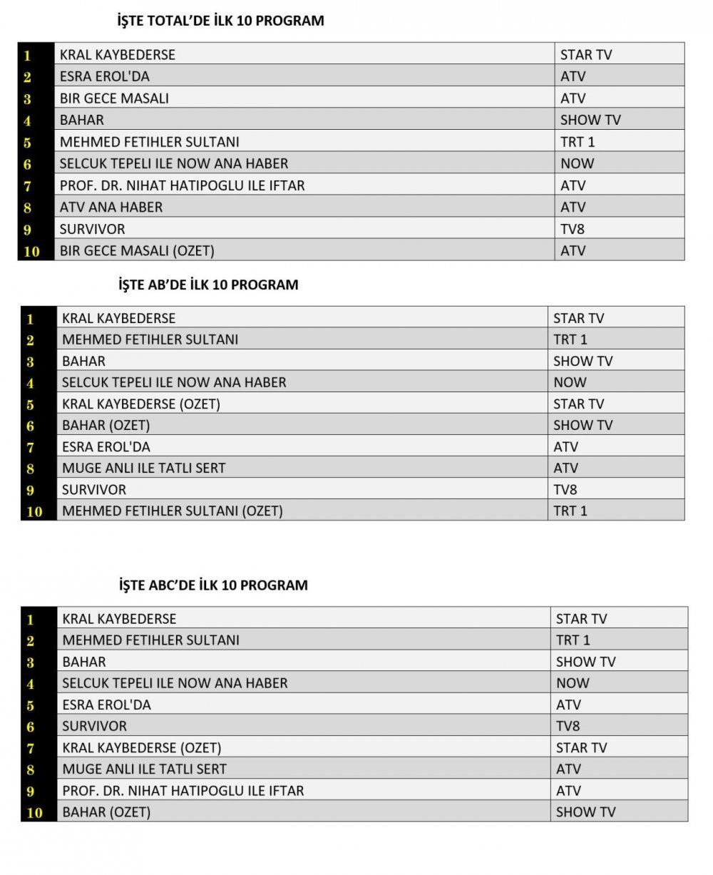 ABC grubunda sıralama AB ile benzer şekilde şekillendi. “Kral Kaybederse” yine zirvede yer alırken, “Mehmed Fetihler Sultanı” ikinci sırada kendine yer buldu. “Bahar” ise istikrarlı bir performans sergileyerek üçüncülüğe yerleşti.