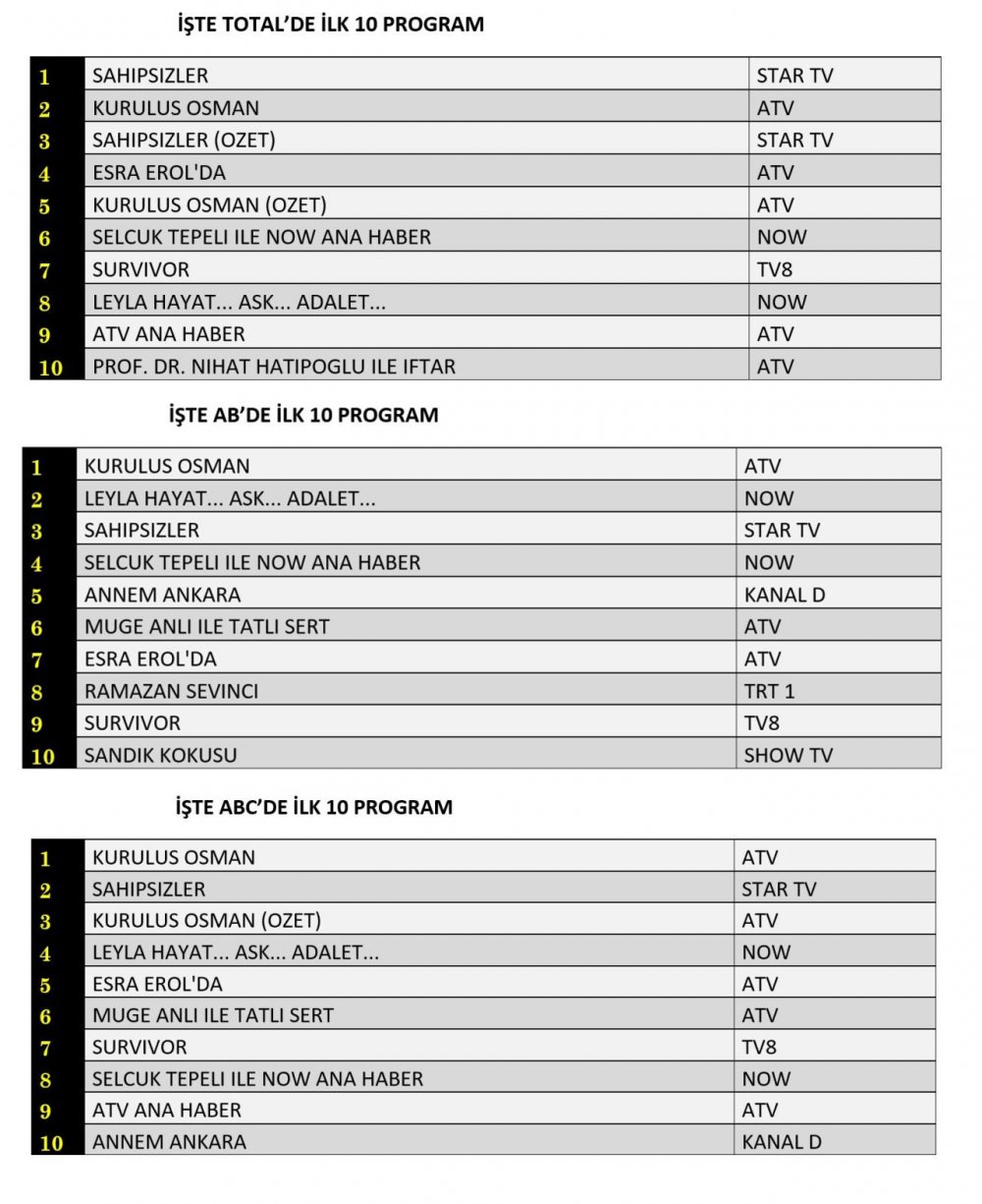 AB grubunda ise zirve Kuruluş Osman’ın oldu. İkinci sırada Leyla Hayat… Aşk… Adalet… yer alırken, üçüncü sırada Sahipsizler dizisi yer aldı.