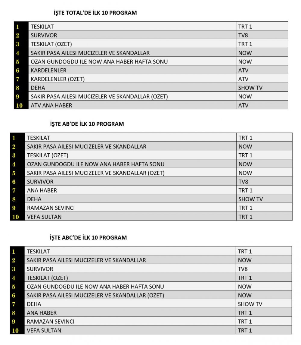 ABC grubunda Teşkilat yine zirvede yer alırken, Now TV’nin dikkat çeken yapımı Şakir Paşa Ailesi ve Mucizeler ve Skandallar ikinci sırada yer aldı. Survivor ise geniş izleyici kitlesiyle üçüncü sırada kendine yer buldu.