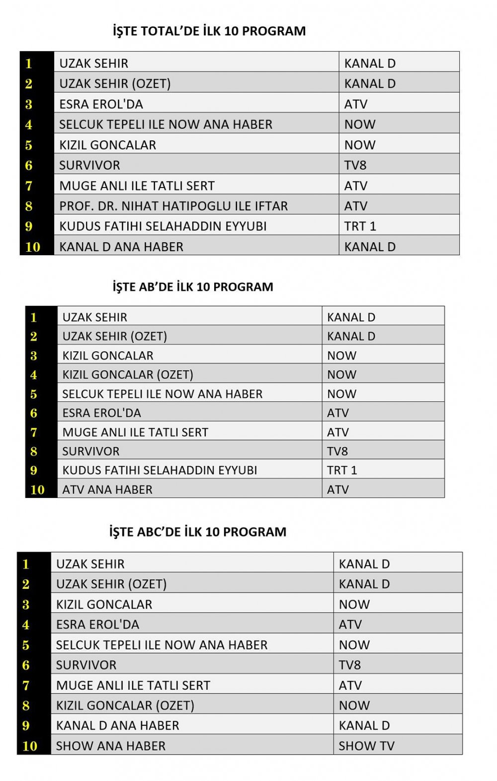 ABC grubunda da tablo değişmedi. Uzak Şehir birinci sırada yer alırken, özeti ikinci sırada konumlandı. Kızıl Goncalar dizisi ise üçüncü sırayı aldı.