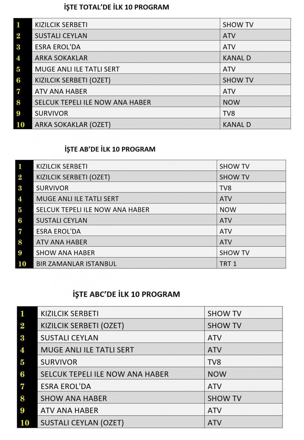 ABC1 Grubu Reyting Sıralaması