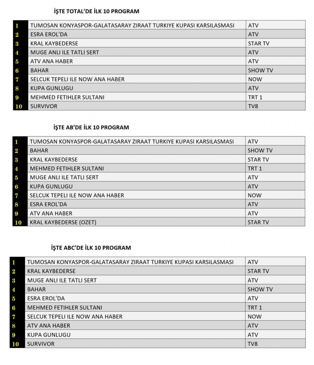 Türkiye Kupası heyecanı Total grubunda zirveye oturdu! Esra Erol’da güçlü duruşunu sürdürürken, Kral Kaybederse ilk üçe girmeyi başardı.