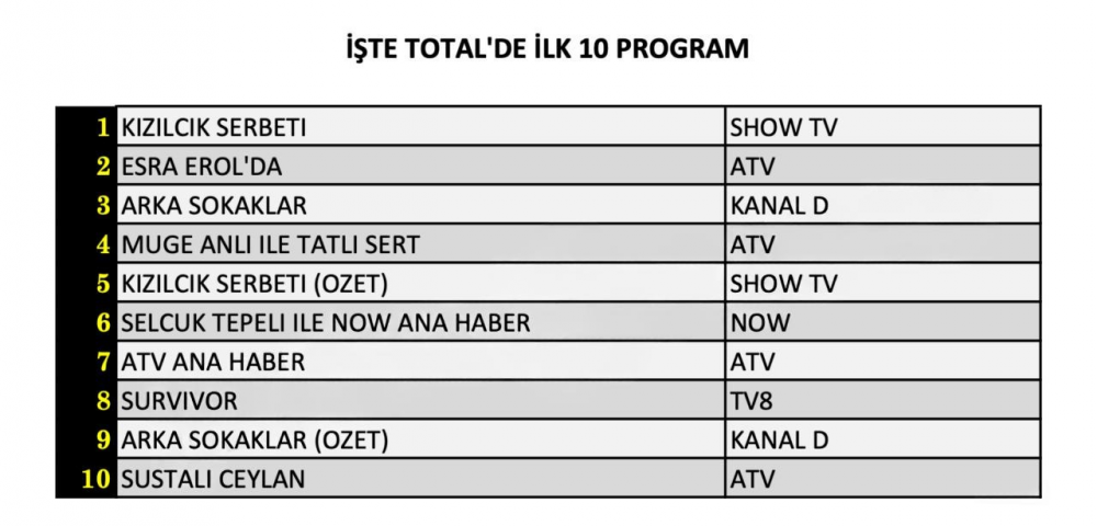 Total’de 1. sırada Show TV’de izleyici ile buluşan “Kızılcık Şerbeti” yer aldı. Total’de 2. sırada ATV’de ekranlara gelen “Esra Erol'da” yer aldı. Total 3. sırada ise Kanal D’de yayınlanan “Arka Sokaklar” yer aldı.