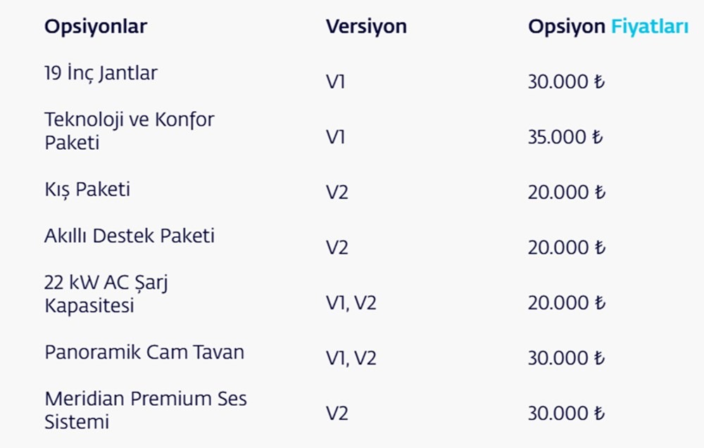 V1 RWD Standart Menzil versiyon 1 milyon 440 bin TL,