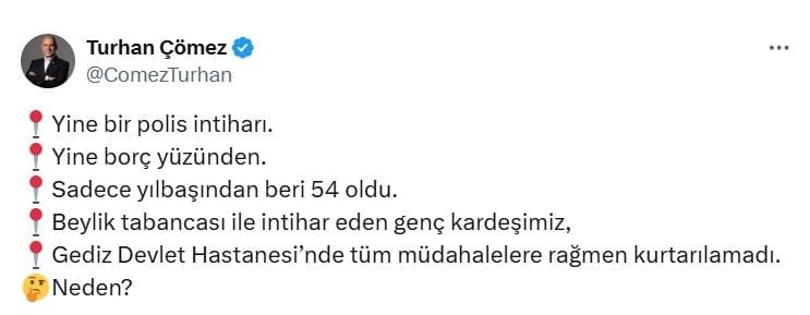 Sosyal medya hesabından son dönemde polis intiharlarının artmasına dikkat çeken Çömez, "Sadece yılbaşından beri 54 oldu. Neden?" dedi.