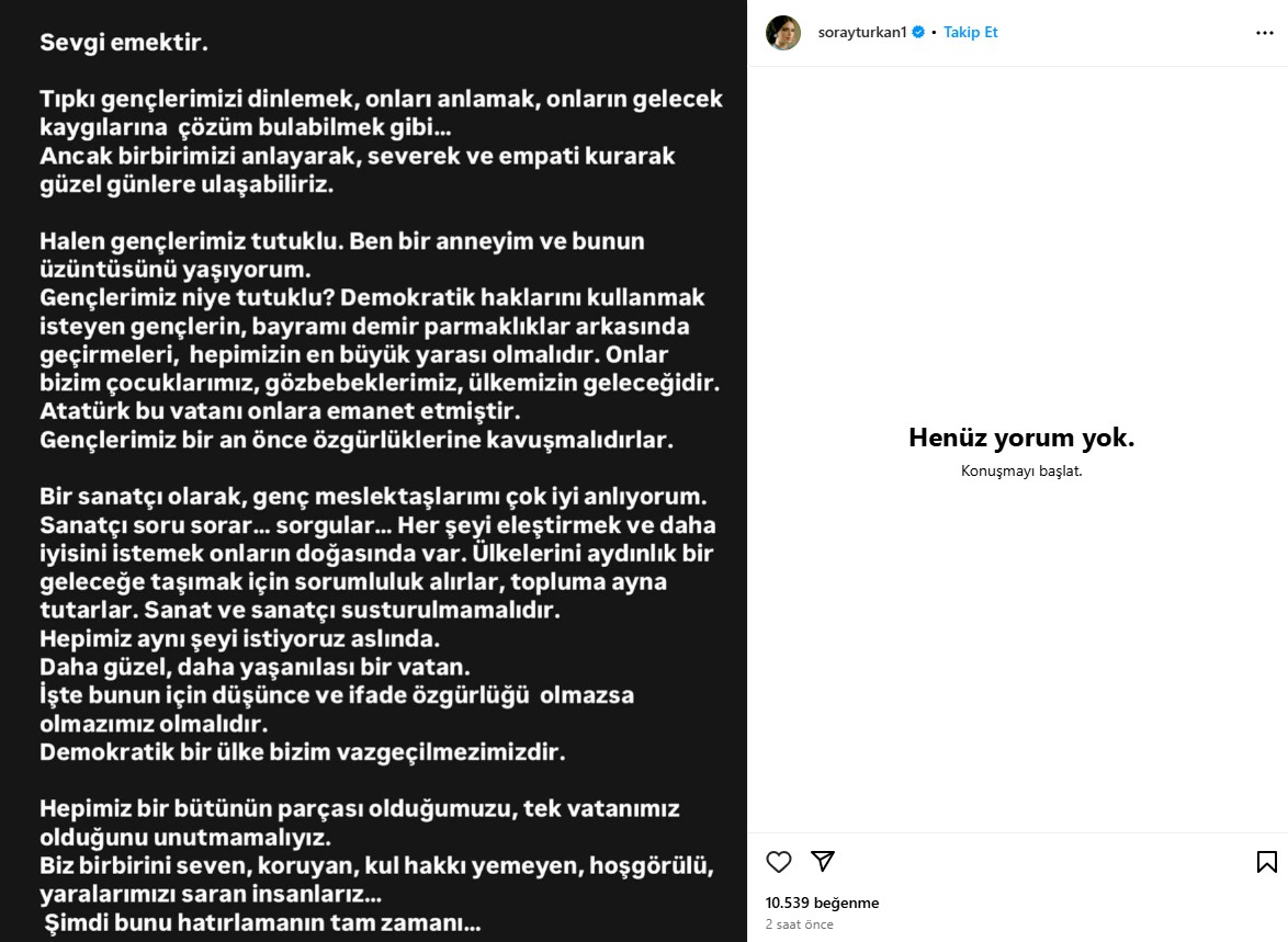Sanatçı Türkan Şoray, sosyal medya hesabından yaptığı paylaşımla, tutuklanan gençlerle baskı altındaki sanatçılara destek verdi.