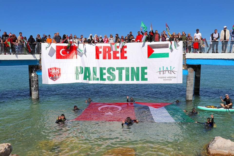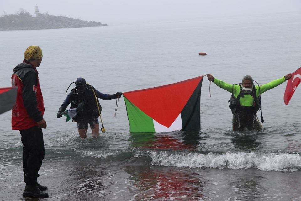 Bir süre deniz altında gezen Ersoy ve Koçal, Türk ve Filistin bayrakları açtı.