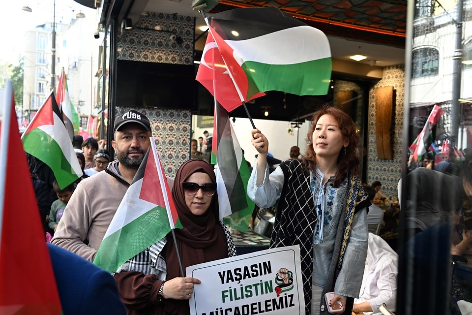 Gazze'ye destek yürüyüşüne çok sayıda turist de eşlik ettiği görüldü.