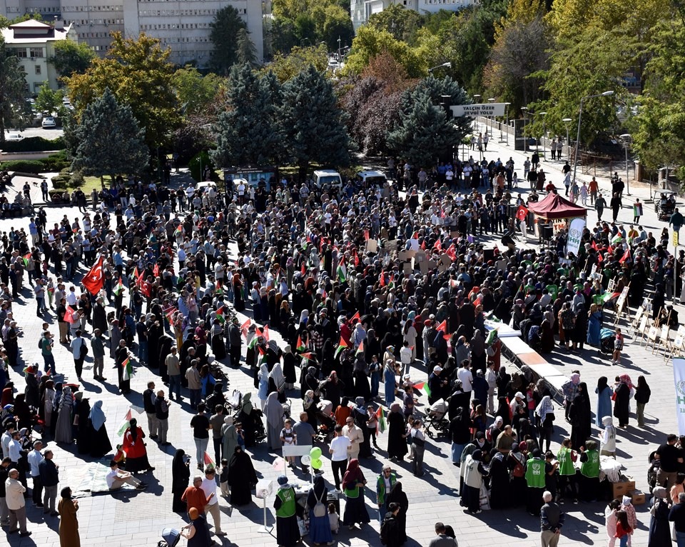 Millet Bahçesi'nde bir araya gelen Filistin'e Destek Platformu üyeleri ile çok sayıda vatandaş, ellerinde Türk ve Filistin bayrakları, döviz ve pankartlarla Demokrasi Meydanı'na kadar yürüdü.