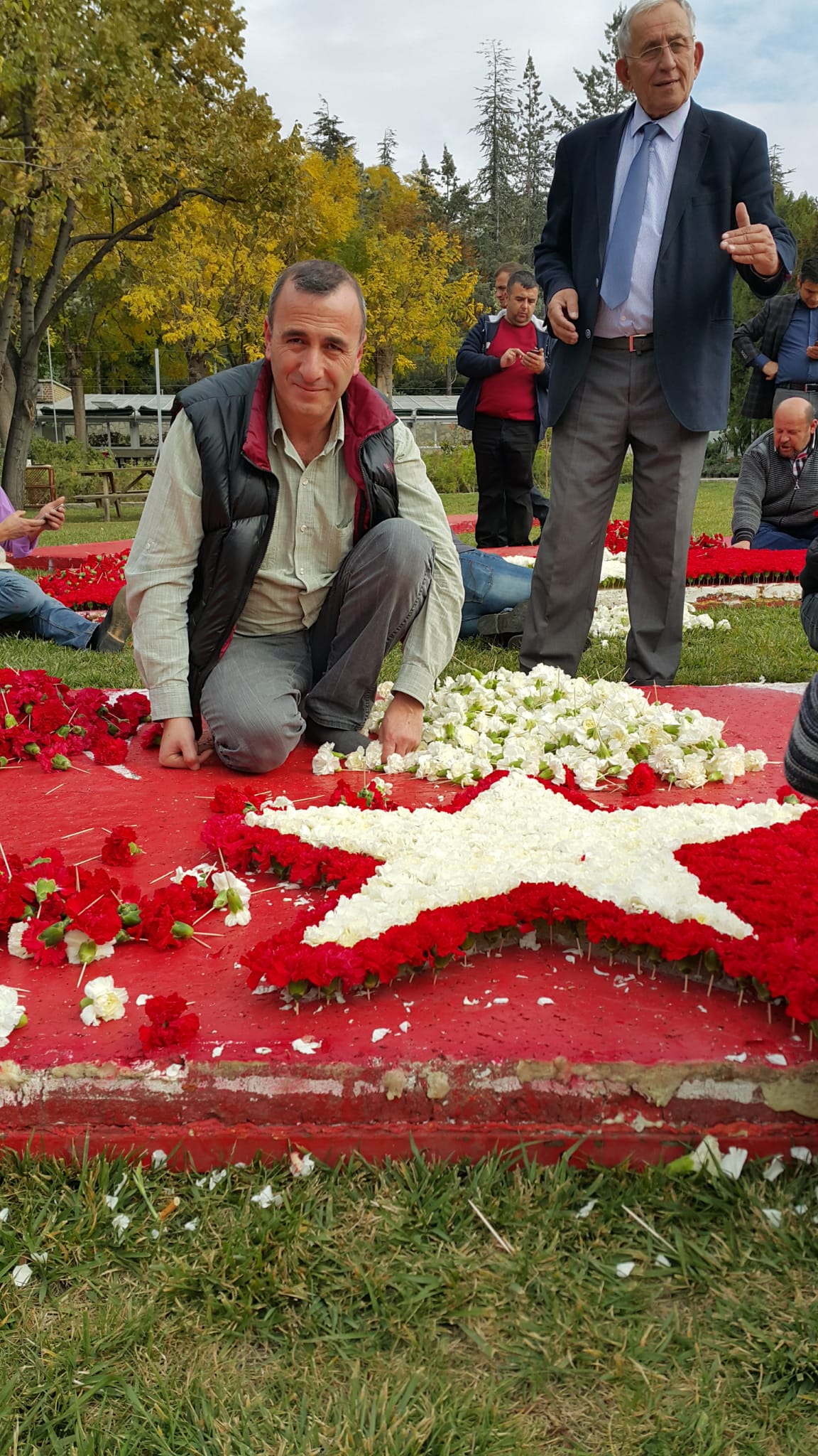 Ayyıldız'a çevrildi. Ayyıldız yapmaya başladık. Daha sonra Atatürk'ün silüeti olur mu olmaz mı tartışması oldu. Yaptık biraz küçük oldu. İlk başta ama fena olmadı yani onu ben yapmadım. Başka bir arkadaşım yaptı. Bunun böyle olmayacağını düşündüm aynı boyutta olması gerektiğini Ayyıldız'ın aynı boyutta olduğu zaman daha şık olacağını düşündüm. Pandemiden önce yaklaşık 6-7 yıl boyunca ben yaptım. Atatürk'ün silüetini ve ayyıldızı ve çünkü tek elden çıkması gerekiyor tam yansıtması için. 2015 yılında Çanakkale'ye gittim. Orada stadyumda Türk bayrağı yaptım. Valilik Talep etti. O zamanlar federasyon başkanlığı yapıyordum. 2019 yılında Yerel Çiçekçiler Derneği olarak Samsun'a gittik sağ olsunlar yine valilik bizim önümüzü açtı. Yaklaşık 24- 25 bin karanfil kullanarak hem Atatürk'ün silüetini hem de ayyıldızını yaptım. Uşak'ta tam tarihini hatırlamıyorum 2017 olabilir ya da 2016 olabilir o vakitte de Uşak'ta çiçekçiler diye yazıldığı zaman basın da var orada da bir Türk bayrağı yaptım sadece Türk bayrağı istediler .