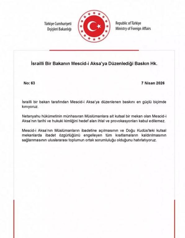 Dışişleri Bakanlığı, "İsrailli bir bakan tarafından Mescid-i Aksa’ya düzenlenen baskını en güçlü biçimde kınıyoruz." açıklamasında bulundu.