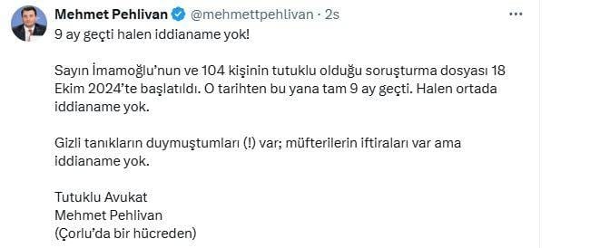 İstanbul Büyükşehir Belediye (İBB) Başkanı ve CHP’nin Cumhurbaşkanı Adayı Ekrem İmamoğlu’nun avukatı Mehmet Pehlivan 10 Haziran'dan beri tutuklu bulunduğu cezaevinden sosyal medya aracılığıyla bir açıklama yayımladı.
