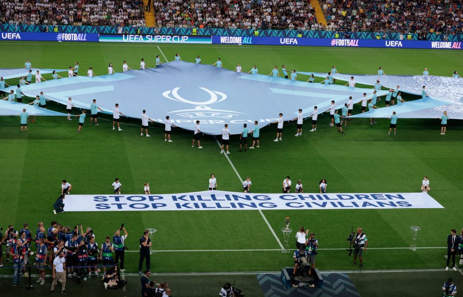 Filistinli futbolcu Süleyman al-Obeid'in İsrail saldırısında hayatını kaybetmesi üzerine paylaştığı taziye mesajıyla tepki çeken UEFA, bu kez sahadan daha net bir mesaj verdi. İtalya'nın Udine kentinde oynanan PSG-Tottenham Hotspur Süper Kupa maçı öncesinde, sahaya serilen pankartlarda "Sivilleri Öldürmeyi Durdurun" ve "Çocukları Öldürmeyi Durdurun" yazıları yer aldı.