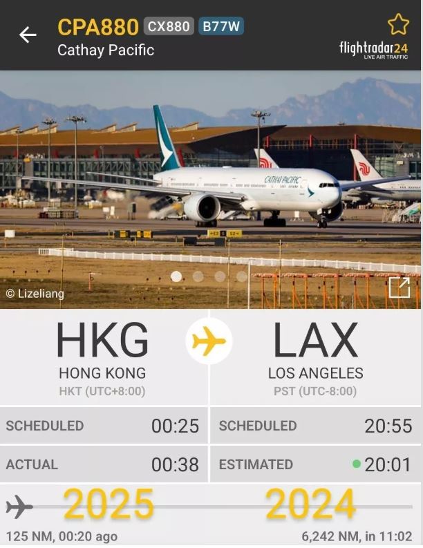 Dünyada ülkeler 2025'e girdi. Hong Kong'dan havalanan uçaktaki yolcular ise, 2024'e döndü. Uçak, 1 Ocak 2025 saat 00.25'te Hong Kong'dan kalkış yaptı ve Pasifik Okyanusu'nu aşarak Los Angeles'a indi. Ancak uçak indiğinde tarih 2024'tü. Böylece yolcular 2025'te bindikleri uçaktan 31 Aralık 2024'te inmiş oldu.