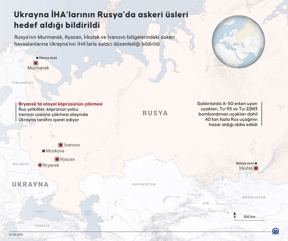 Ukrayna'nın "düşman bombardıman uçaklarını imha etmeyi amaçlayan büyük çaplı özel bir operasyon" yürüttüğü resmen açıklandı. Yetkili, saldırıların istihbarat teşkilatı tarafından gerçekleştirildiğini ve aynı anda dört Rus askeri hava üssünün vurulduğunu söyledi.